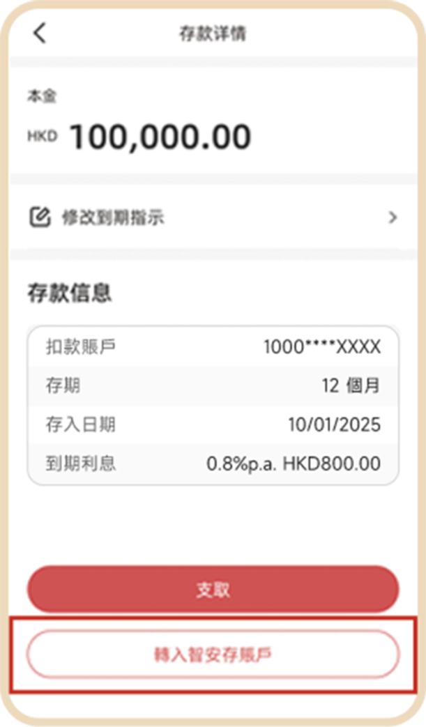 您可隨時將定期存款由綜合賬戶轉入指定賬戶,一旦定期存款轉入指定賬戶後,於定期存款到期時,其本金、利息及加息券所獲得的獎勵利息(如適用)只會存入該指定賬戶。